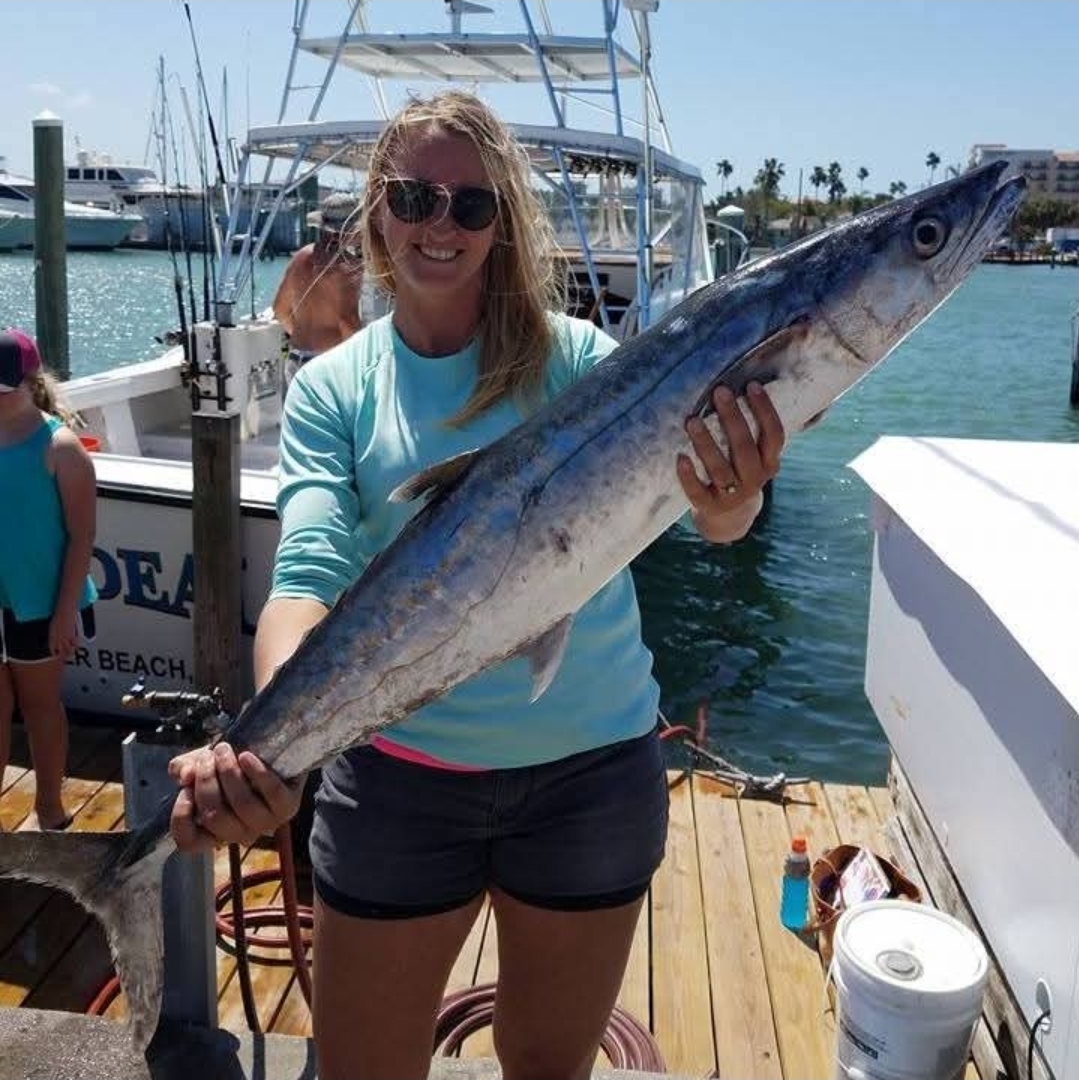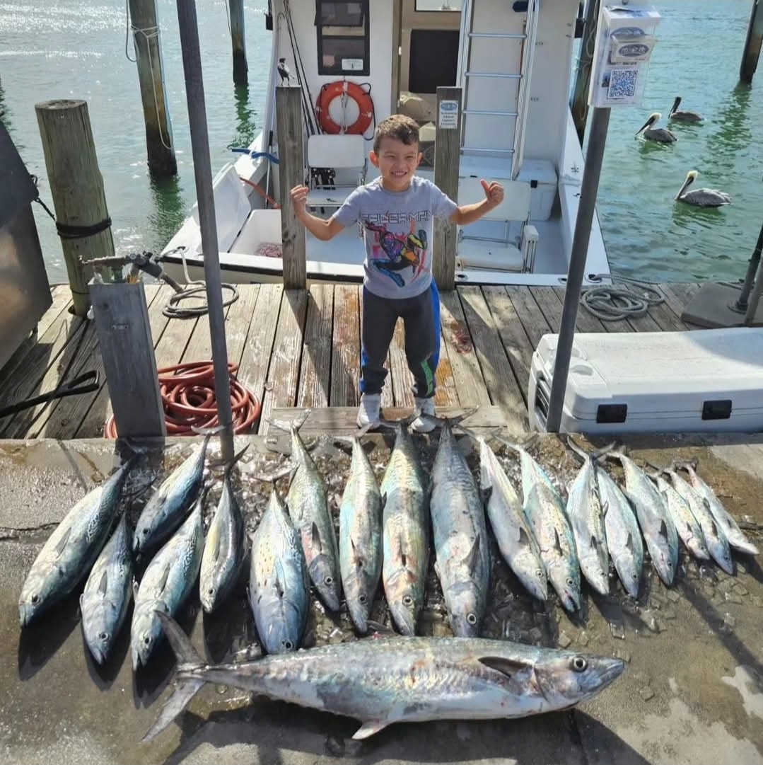 Kingfish (king mackerel) are migratory and run up and down our west coast of Florida in spring and fall. When the water temps rise we usually start to see them in mid March. We troll for kings along with Spanish mackerel, bonita, and sometimes barracuda. The average sized kingfish we catch are around 12 pounds but we have caught them up to 50 pounds before!
